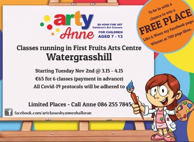 Anne O’Halloran runs children’s art classes in the First Fruits Arts Centre after school on Fridays between 3:15 pm and 4:30 pm. These classes are very popular, and space is limited so pre-booking is essential.