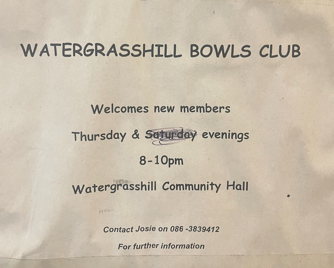Presently each Thursday 8pm – 10pm, Watergrasshill Community Centre